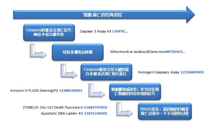细胞凋亡是指细胞在生长到一定阶段及某些生理过程中,会受到多因素和机制的严格调控而进入死亡。这是一个动态的过程,会涉及一系列复杂的生化反应, 是一个需要酶参与的级联反应,同时也涉及不同基因的表达及调控、信号传导。其中有几项生理过程能被用来检测凋亡的发生,因此多参数分析法对于准确检测这一过程十分重要。同时,了解细胞死亡和存活机制也是毒理分析和药物研发应用中一个非常关键的内容。 Sigma®联合Roche®提供多种分析细胞凋亡的研究方法。包括:Caspase活性检测;DNA片段化分析和检测;膜变化检测(AnnexinV染色、膜电位、线粒体功能完整性分析检测实验)及细胞形态学检测。